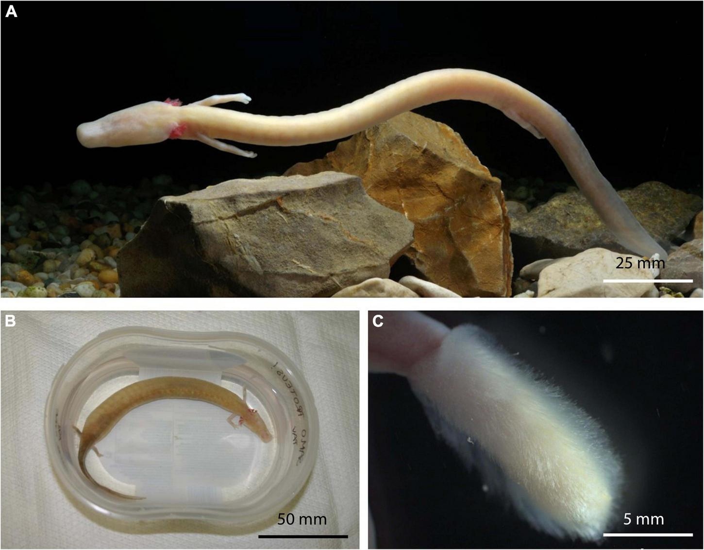 Sinh vật này sở hữu tứ chi rất nhỏ bé, trong đó chi trước chỉ có ba ngón và chi sau hai ngón – một điểm khác biệt lớn so với cấu trúc bốn ngón và năm ngón của các loài lưỡng cư thông thường. Phần đuôi của chúng có một lớp vây mỏng, kết hợp cùng hệ thống mang ngoài màu đỏ bao quanh cổ, thoạt nhìn trông rất giống với bờm rồng.