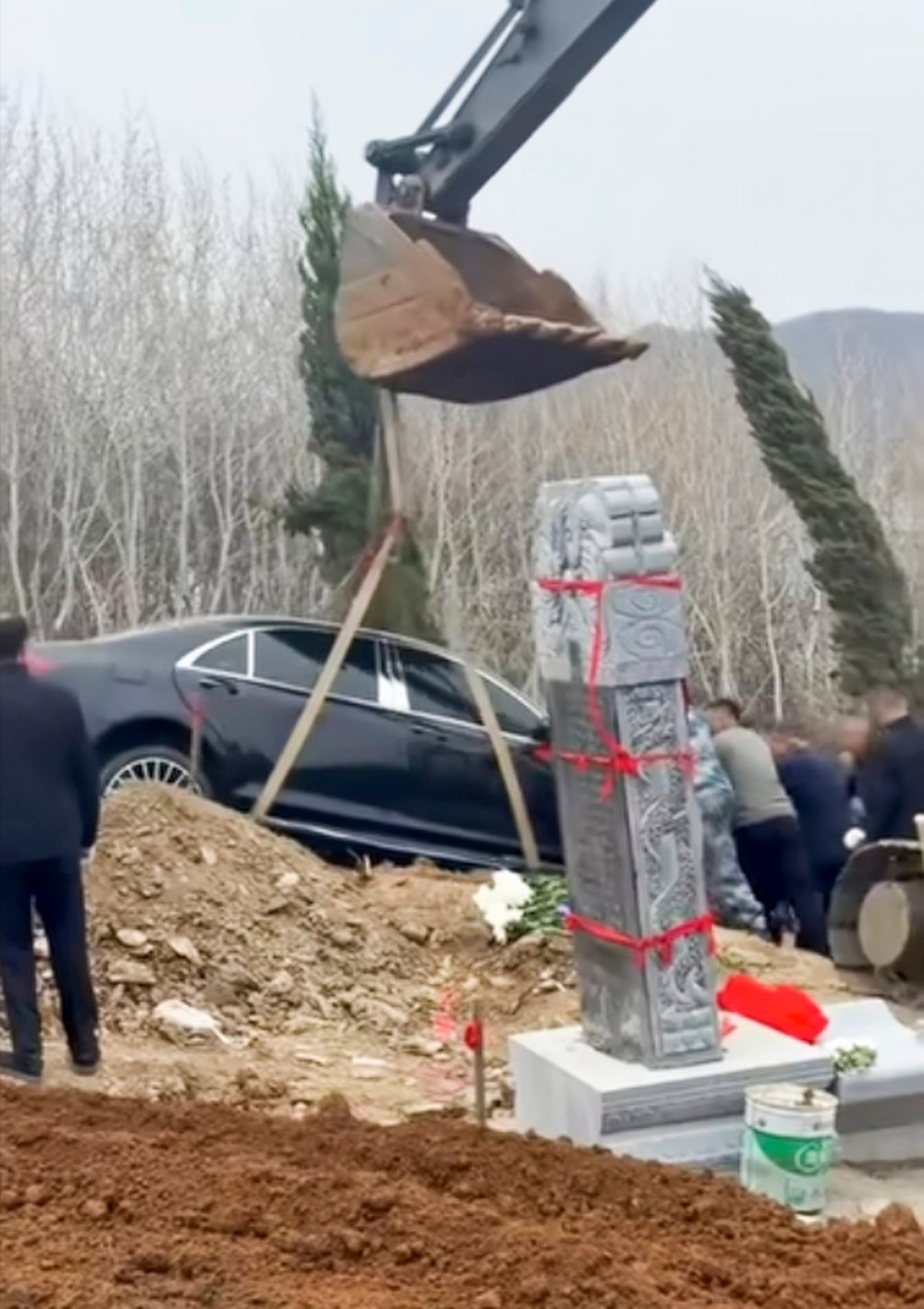 Một đoạn video lan truyền nhanh chóng trên mạng xã hội đã ghi lại toàn bộ quá trình diễn ra sự việc. Hình ảnh từ hiện trường cho thấy một chiếc máy xúc đang cẩn thận nâng chiếc Mercedes-Benz đặt xuống huyệt mộ ngay cạnh một tấm bia đá mới được dựng lên.